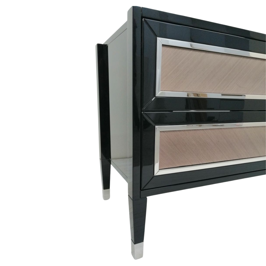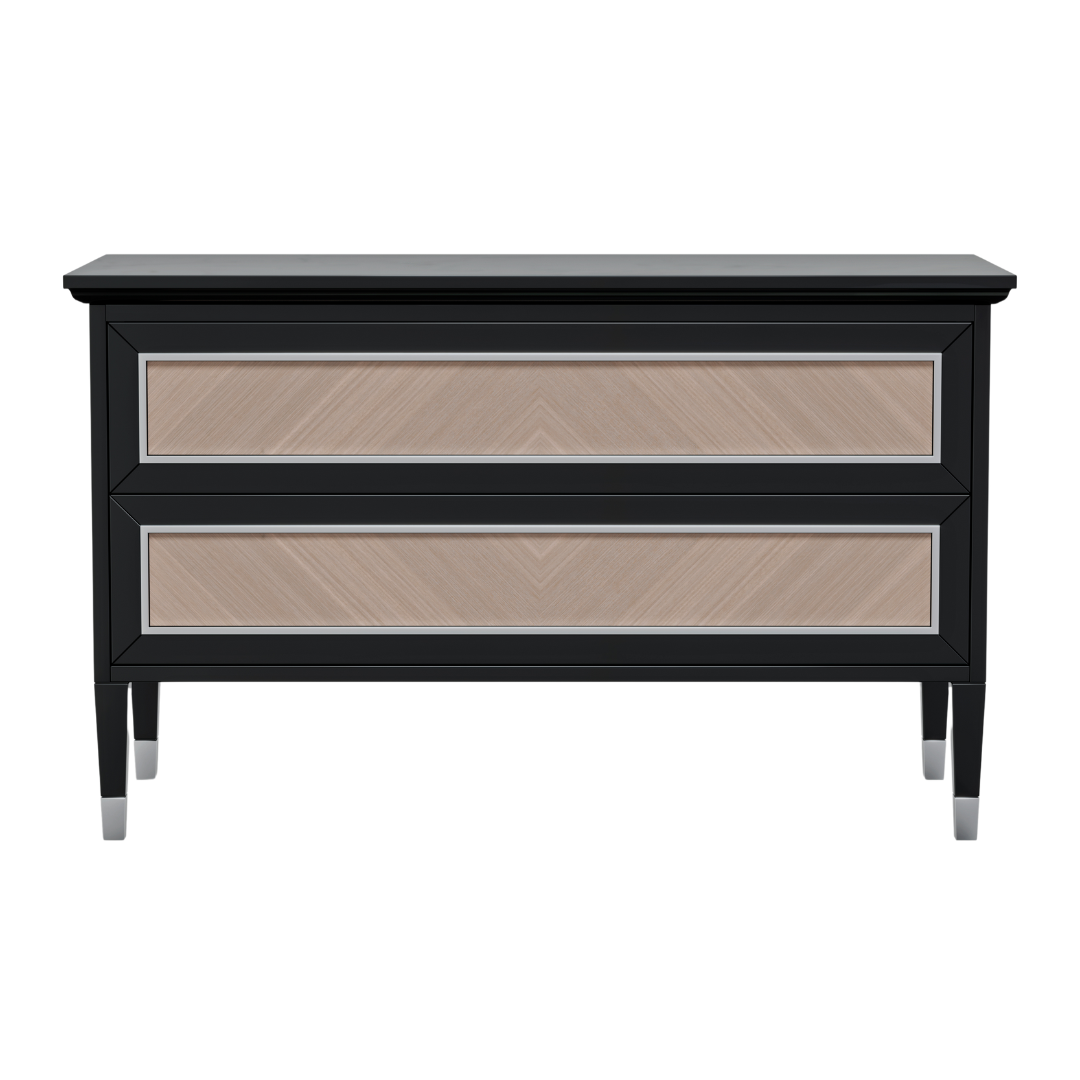 Эксклюзивный комод Чиаро для ценителей роскоши. Сдержанный холодный блеск элементов из нержавеющей стали гармонично сочетается с декоративными вставками из шпона tabu. Наши мастера-краснодеревщики вручную составляют великолепный узор из шпона, учитывая завораживающий рисунок натурального дерева. Точеные выступающие опоры подчеркивают безупречность и элегантность линий комода Чиаро.